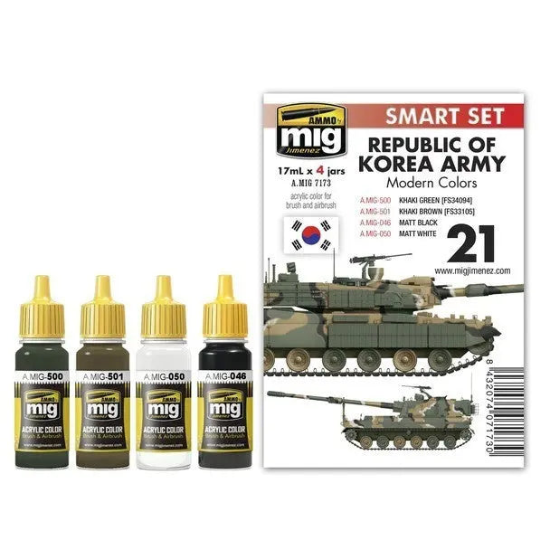 High quality acrylic paints specially designed to represent the camouflage used by the contemporary Republic of Korea Army. With these colours you will be able to accurately paint the latest models of vehicles including ROTEM K, K200 APC, and K-9 self-propelled guns.