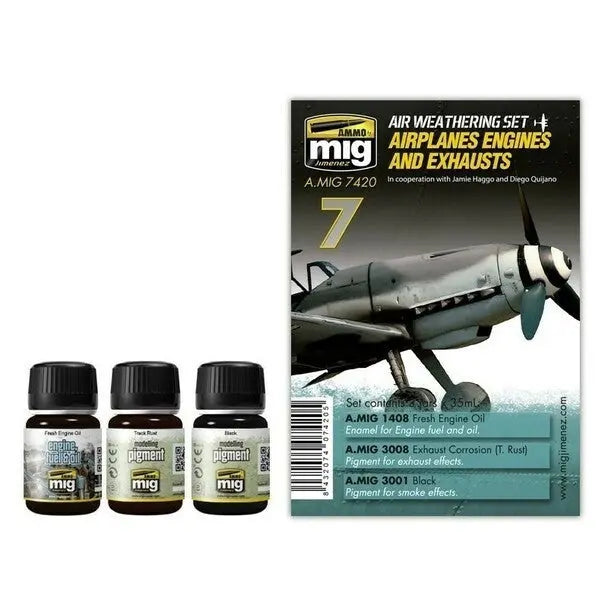 Weathering aircrafts set. With this set you can add life easily to an engine and exhaust of your airplane, creating the effects of spilled fuel, little touches of rust, and general maintenance spills. The set includes an enamel product to paint spilled fuel (A.MIG-1408 FRESH ENGINE OIL) and two pigments perfect to rust and blacken exhaust and other areas of the aircraft (A.MIG-3001 BLACK y A.MIG-3008 TRACK RUST)