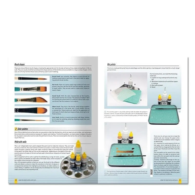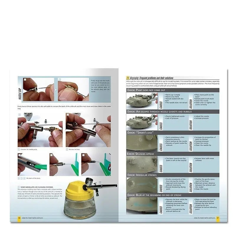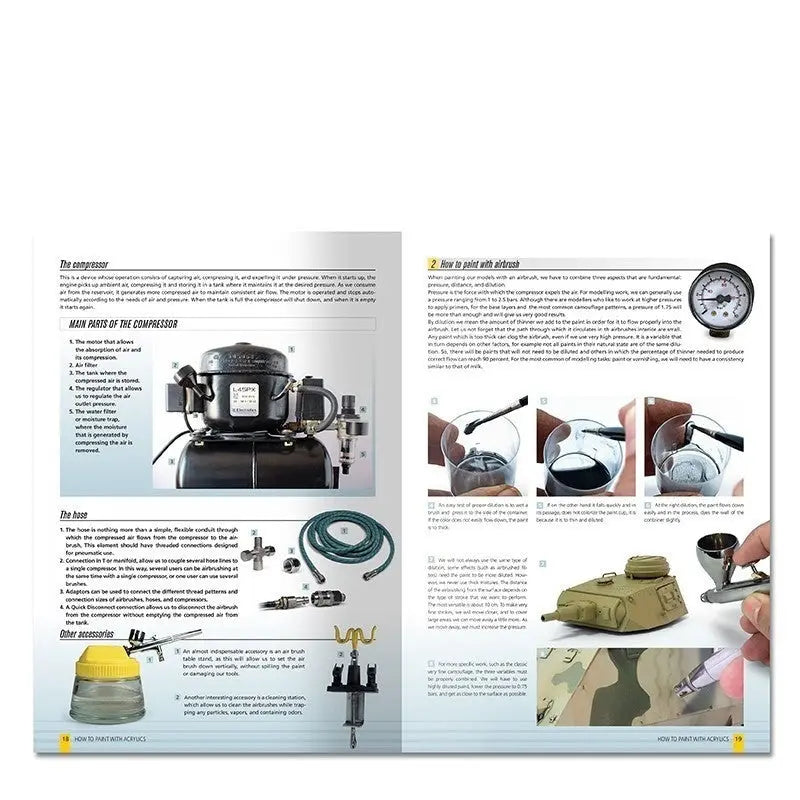 For these reasons, the AMMO team has produced this complete Acrylics guide containing all the tips and techniques necessary for painting all genre of models, from figures and military vehicles to dioramas and aircraft. The book not only shows how to use the paints, but also explains proper use of auxiliary acrylic products, how to work with the airbrush, how to apply metallic colors, transparent colors and varnishes, and how to paint a model entirely with brushes. We explore the tools used as well as basic weathering techniques with non-toxic products.