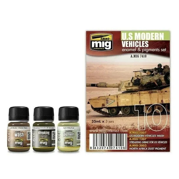 The necessary set for weathering American vehicles in Iraq or Afghanistan. The modeler may apply a wash and make streak effects with the perfect enamel color and apply the pigment with the right tone for a nice, balanced weathered vehicle. Recommended for use in combination with acrylic-based A.MIG FS 33446 U.S. 025 MODERN VEHICLES color. Includes products: