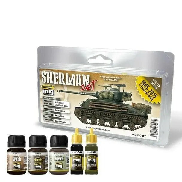 Set with essential and necessary products to paint late WWII Sherman tanks, FOR EXAMPLE any of those which appears in ‘Fury’ motion picture. The easiest and fastest solution for all modellers, from the experienced modeller who needs basic products for these vehicles to the newcomer that needs the neccesary ítems to begin to paint a Sherman. A basic compilation of some of the better AMMO products.