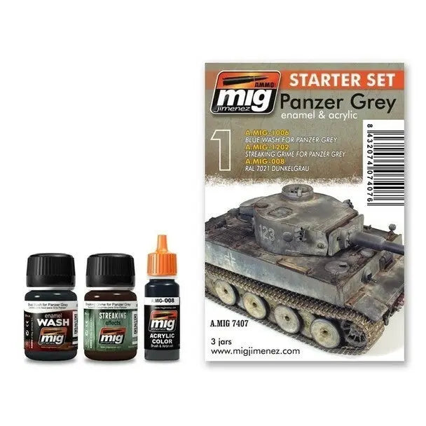The basic, but indispensable color set to paint German vehicles in the Panzer Grey color used during the early stages of Second World War. The modeler may use the gray base color with acrylic paint Panzer RAL 7021 DUNKELGRAU, make a perfect wash with color BLUE WASHFOR PANZER GREY and make streaking grime effects with STREAKING GRIME FOR PANZER GREY. One set for all the essential products for a vehicle of this color.