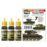 Acrylic paint set with accurate colors for the 3 most common paints used by Russian vehicles during WW II. Modelers can paint these vehicles without complex mixtures and hours of research. All products are acrylic and are formulated for maximum performance both with brush or airbrush and the Scale Effect Reduction will allow us to apply the correct color on our models. Water soluble, odorless and non-toxic. Shake well before each use. Each jar includes a stainless steel agitator to facilitate mixture. We recommend MIG -2000 Acrylic Thinner for a correct thinning. Dries completely in 24 hours. Includes colors: